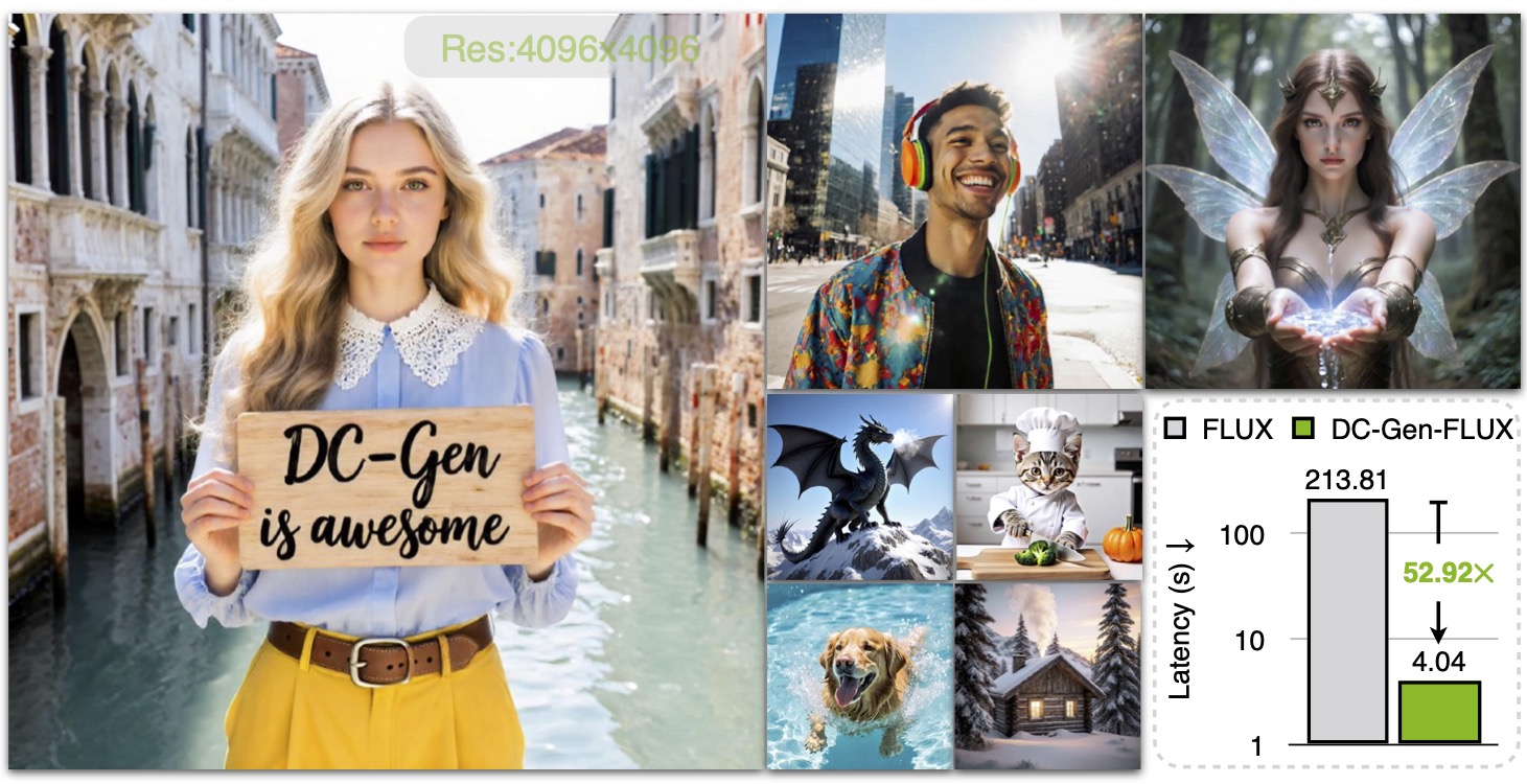 DC-Gen is a new acceleration framework for diffusion models. DC-Gen works with any pre-trained diffusion model, boosting efficiency by transferring it into a deeply compressed latent space with lightweight post-training. For example, applying DC-Gen to FLUX.1-Krea-12B takes just 40 H100 GPU days. The resulting DC-Gen-FLUX delivers the same quality as the base model while achieving dramatic gains—53× faster inference on H100 at 4K resolution. And when paired with NVFP4, DC-Gen-FLUX (20 sampling steps) generates a 4K image in only 3.5 seconds on a single NVIDIA 5090 GPU.