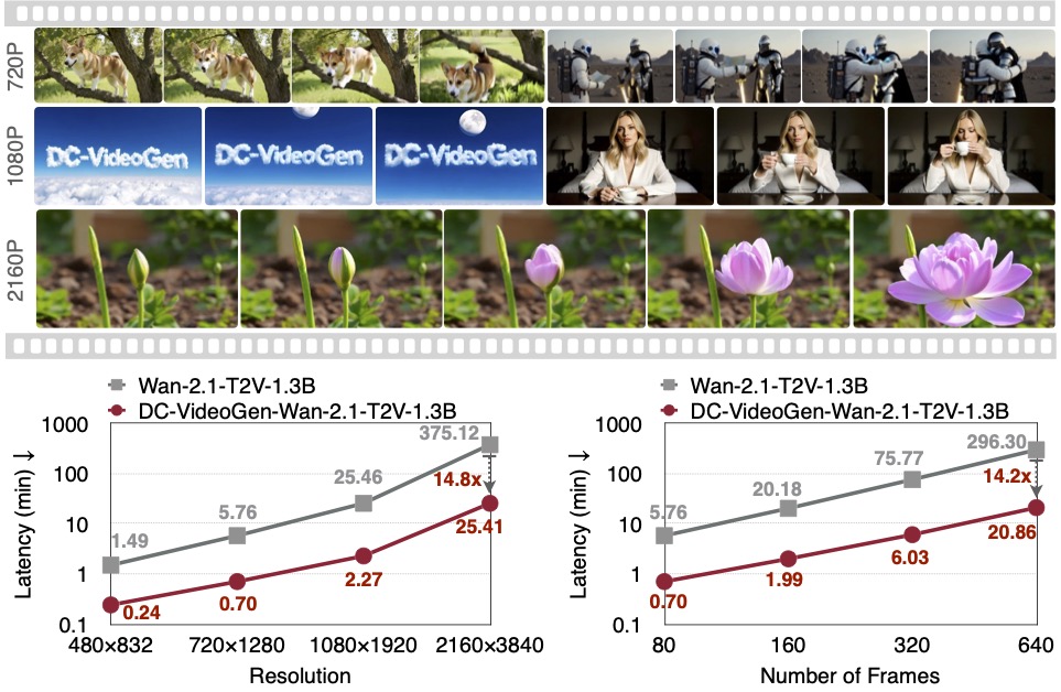 DC-VideoGen is a post-training acceleration framework that can be applied to any pre-trained video diffusion model, improving efficiency by adapting it to a deep compression latent space. The framework builds on two key innovations: (i) a Deep Compression Video Autoencoder that achieves 32x/64x spatial and 4x temporal compression; and (ii) AE-Adapt-V, a robust adaptation strategy that enables rapid and stable transfer of pre-trained models into the new latent space. Adapting the Wan-2.1-14B model with DC-VideoGen requires only 10 H100 GPU days. The accelerated models achieve up to 14.8x lower latency than their base counterparts without compromising quality, and further enable 4K video generation on a single GPU.