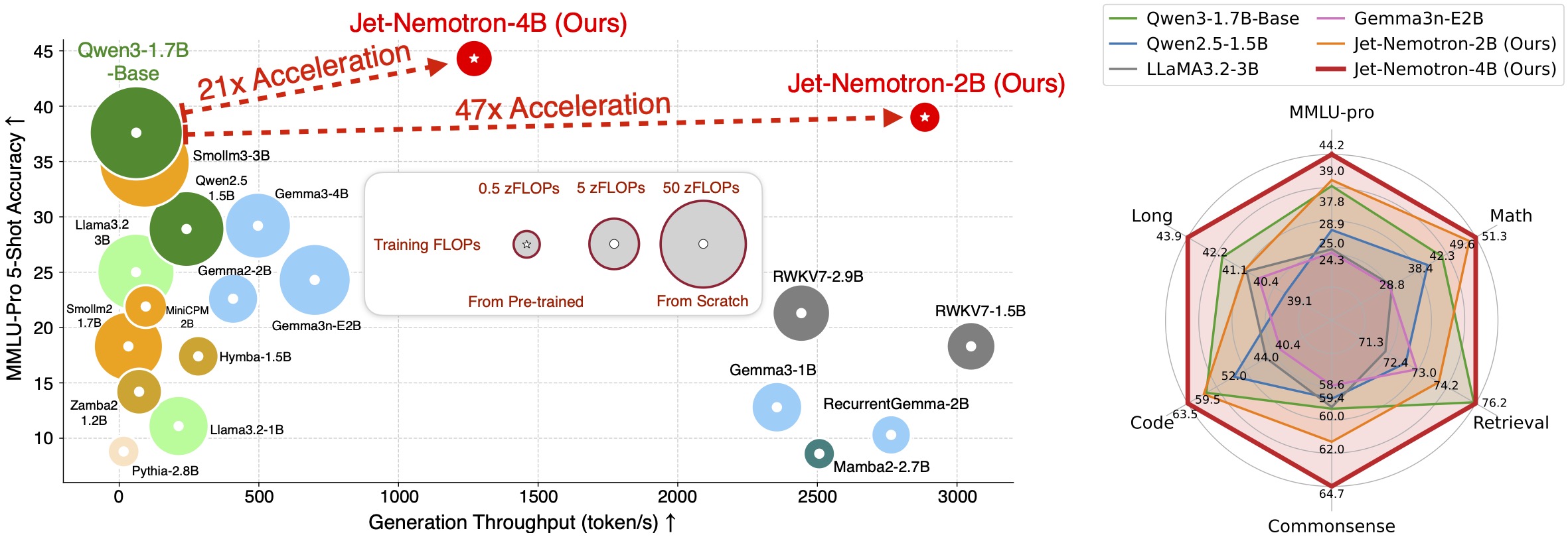 Jet-Nemotron is a new family of hybrid-architecture language models that surpass state-of-the-art open-source full-attention language models such as Qwen3, Qwen2.5, Gemma3, and Llama3.2, while achieving significant efficiency gains—up to 53.6× speedup in generation throughput on H100 GPUs (256K context length, maximum batch size).